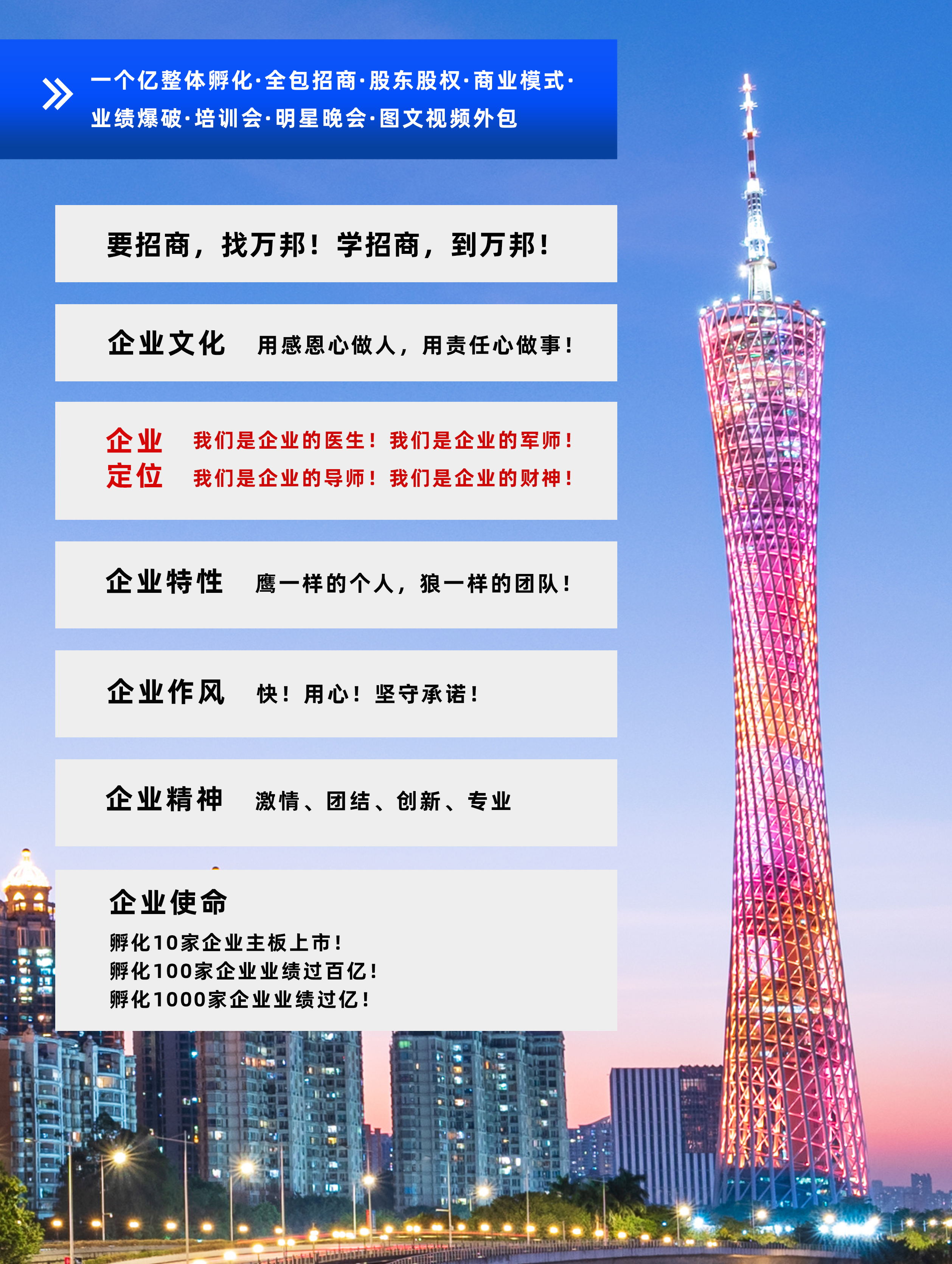 萬(wàn)邦集團(tuán)成立于2003年6月,專注于為企業(yè)進(jìn)行招商和整體孵化,包含公司診斷、產(chǎn)品定位到量身打造商業(yè)模式系統(tǒng),再到投人、投錢(qián)、投資源,一起干的分紅股東招募,鐵血軍團(tuán)的打造,全國(guó)招商會(huì)議,為企業(yè)建立一套完善;成熟的招商系統(tǒng),教育系統(tǒng)、培訓(xùn)系統(tǒng)。